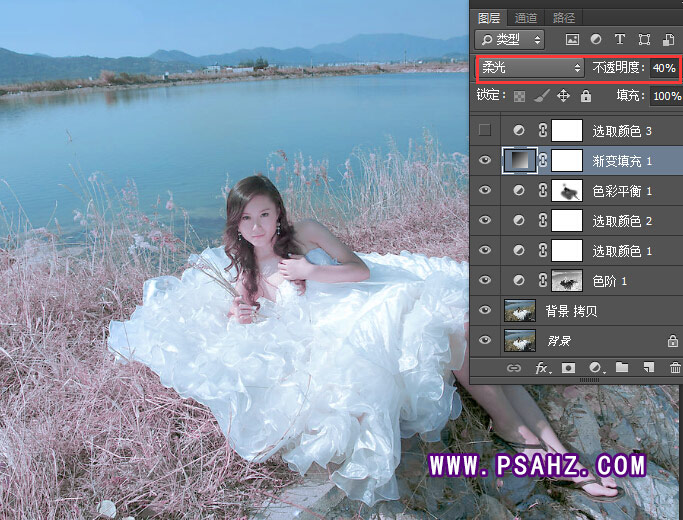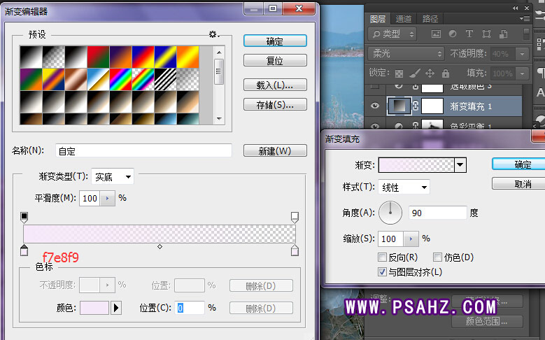 5、创建渐变填充调整层,选择,渐变到透明渐变,颜色值为-f7e8f9 混图层合模式为-柔光-不透明度-40
