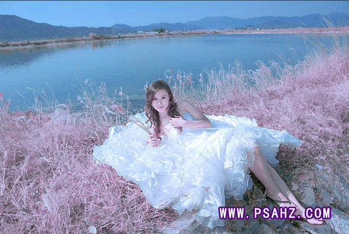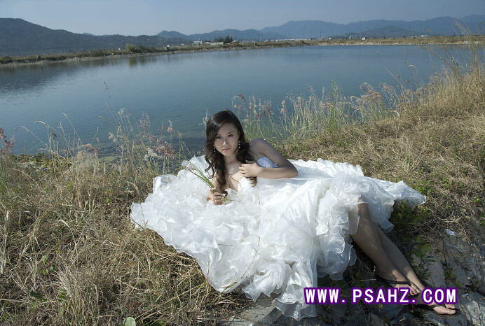 Photoshop调色教程学习:把外景美女婚纱照调出漂亮唯美紫色调