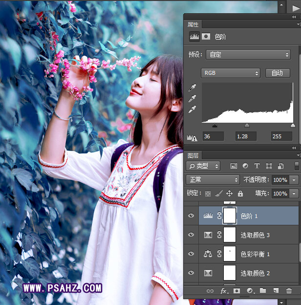 6、创建色阶调整层,增强画面明暗对比,使发灰画面明亮通透一点。