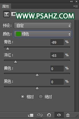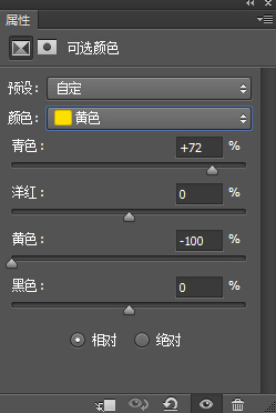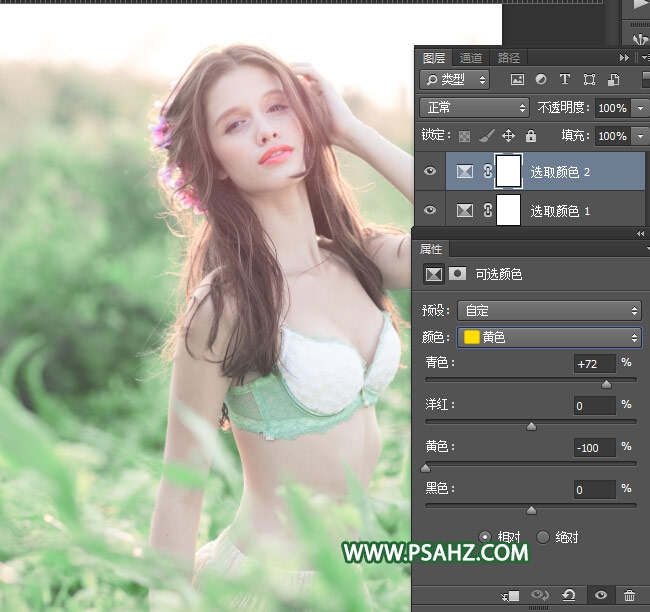 2、创建可选颜色调整层,对其黄色、绿色、进行色彩调整,这一步是继续把黄色减少。