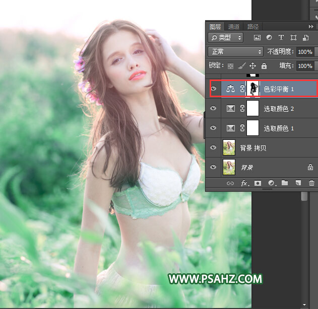 Photoshop给性感的欧美内衣美女照片调出清新柔美青色效果
