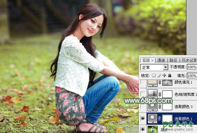 Photoshop美女图片调色教程:给外景美女照片调出甜美的粉黄色效果,素材图片主色为绿色,处理的时候只需要把绿色稍微调淡,高光部分增加一点淡黄色,然后再把人物肤色调红润,整体调柔和即可。 原图 最终效果 1、打开素材图片,创建可选颜色调