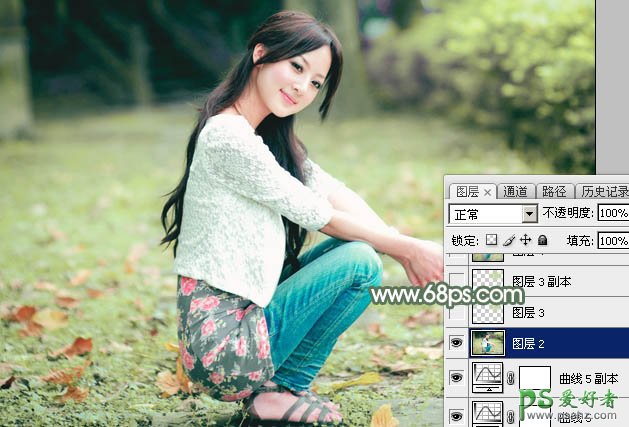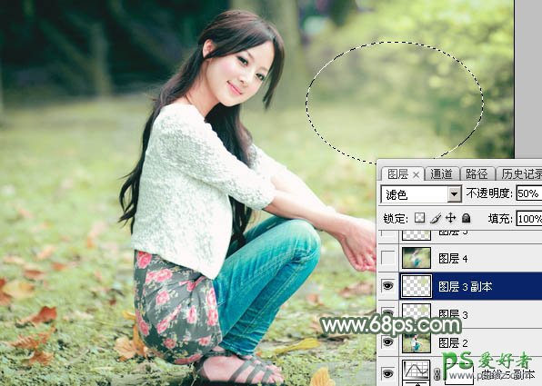 14、新建一个图层,混合模式改为“滤色”,不透明度改为:50%,把前景颜色设置为绿色:#C7D79D,用画笔把下图选区部分涂上前景色。这一步给图片局部增加高光。