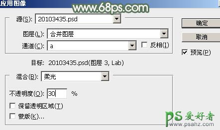 13、新建一个图层,盖印图层,选择菜单:图像 > 应用图像,参数及效果如下图。确定后再选择菜单:图像 > 模式 > RGB颜色,在弹出的对话框选择“不合拼”。