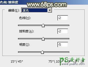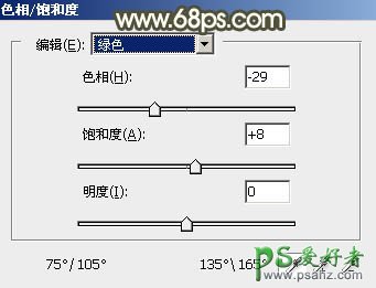 3、创建色相/饱和度调整图层,对黄色,绿色进行调整,参数及效果如下图。这一步给图片增加黄褐色。
