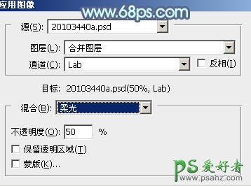 7、新建一个图层,按Ctrl + Alt + Shift + E 盖印图层。选择菜单:图像 > 模式 > Lab颜色,在弹出的对话框选择“不合拼”。然后选择菜单:图像 > 应用图像,参数及效果如下图。