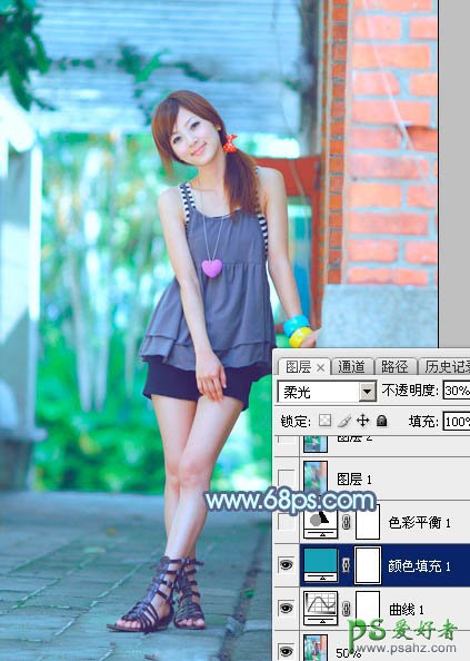 8、创建纯色调整图层,颜色设置为青色:#15A2B7,确定后把混合模式改为“柔光”,不透明度改为:30%,效果如下图。