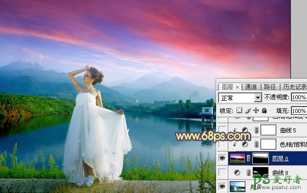 PS婚纱照调色:给水库边自拍的美女婚片调出梦幻意境晨曦阳光色