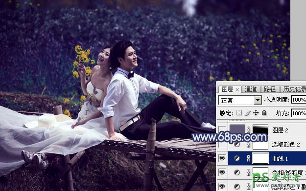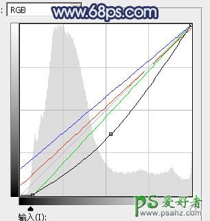 4、创建曲线调整图层,对RGB、红、绿、蓝通道进行调整,参数及效果如下图。这一步把图片暗部颜色加深,并增加蓝紫色。