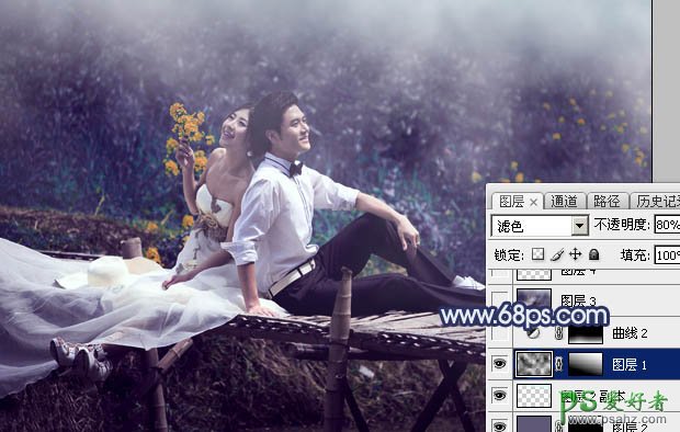 8、新建一个图层,按字母键“D”把前,背景颜色恢复到默认的黑白,然后选择菜单:滤镜 > 渲染 > 云彩,确定后把混合模式改为“滤色”,不透明度改为:80%。添加图层蒙版,用黑白渐变由右上往下拉出白色至黑色线性渐变,效果如下图。