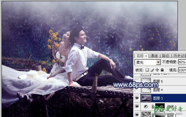 11、用套索工具拉出下图所示的选区,羽化80个像素后按Ctrl + J 把选区部分的图像复制到新的图层,混合模式改为“柔光”,不透明度改为:100%,如下图。