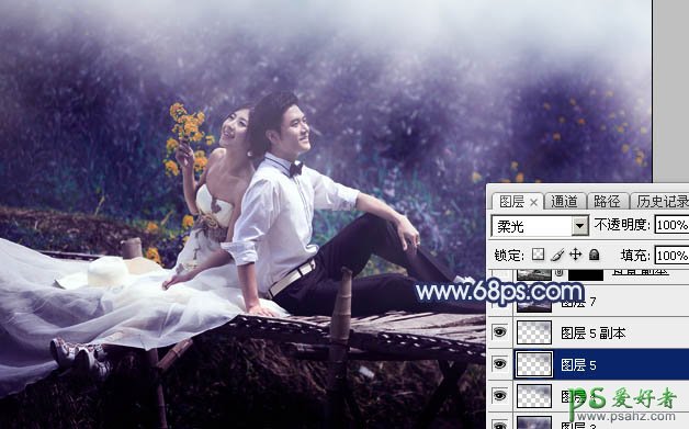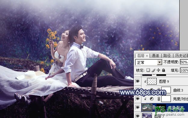 PS婚片后期美化调色教程:给田园中浪漫的情侣婚片调出深蓝色效果