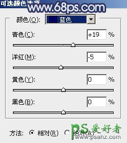 14、创建可选颜色调整图层,对蓝色进行调整,参数及效果如下图。这一步微调图片中的蓝色。