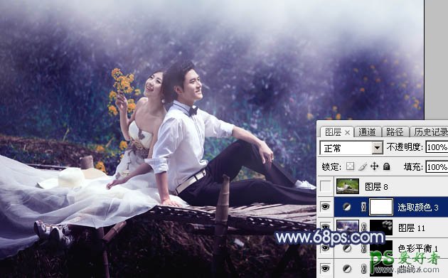 PS婚片后期美化调色教程:给田园中浪漫的情侣婚片调出深蓝色效果