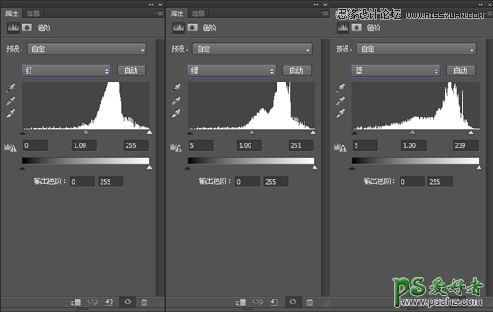接下来这一步很关键!我新建一个色阶调整图层,从色阶里面调整色彩的通透度!还是从红绿蓝入手!具体参数根据照片而定。