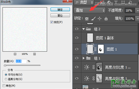 新建一个空白图层,填充白色,然后点击滤镜—杂色—添加杂色,数量根据效果而定。接下来将图层模式改为叠加方式,调整透明度,并对该图层高斯模糊一下,数值不可过大,一般2到3即可。这一步是把颗粒状模糊一下,使其看起来不那么明显。