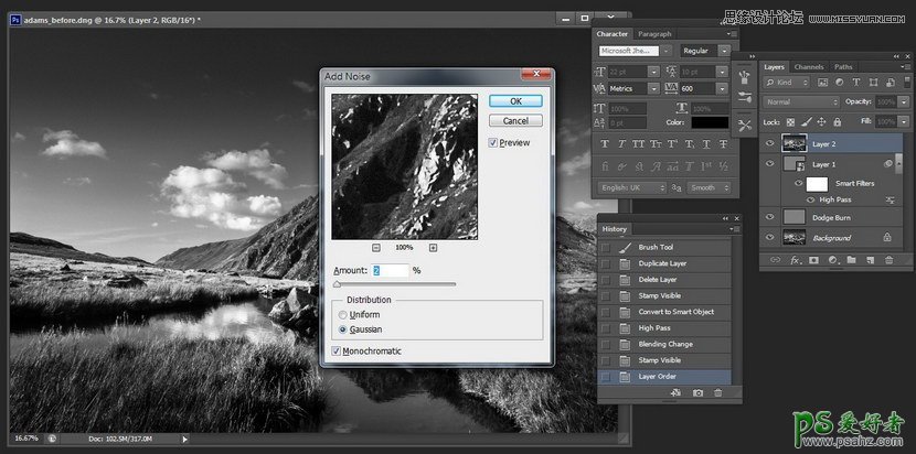 17)由于天空做过一次渐层,感觉有点生硬,所以再选择Background及 Dodge Burn,然后按Ctrl+Shift+Alt+E以合成一个新图层,并到Filter>Noise>Add Noise,选择Amount为2、Distribution为Gaussian及剔选Monochromatic即可。