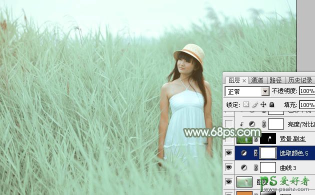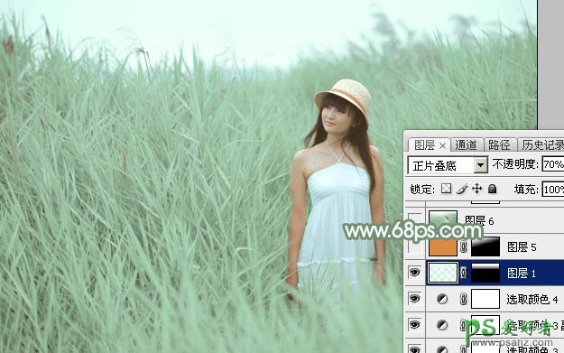 10、按Ctrl + Alt + 2 调出高光选区,新建一个图层填充淡绿色:#E3FEF5,混合模式改为“正片叠底”,不透明度改为:70%,按住Alt键添加图层蒙版,用白色画笔把天空部分擦出来,效果如下图。这一步给天空部分增加淡绿色。