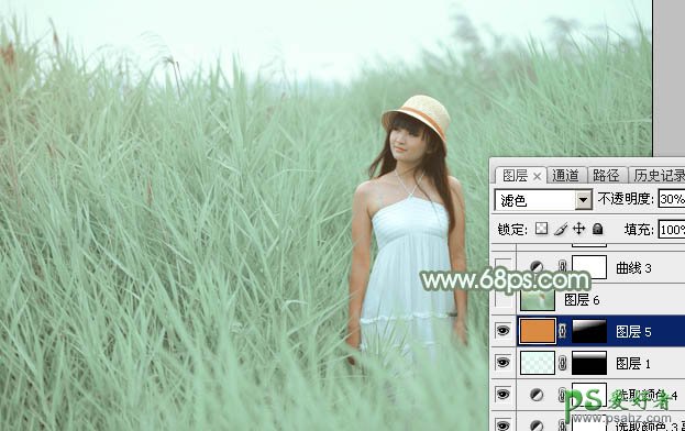 11、新建一个图层,填充橙红色:#DA8A41,混合模式改为“滤色”,不透明度改为:30%,按住Alt键添加图层蒙版,用白色画笔把顶部需要增加高光的部分擦出来。