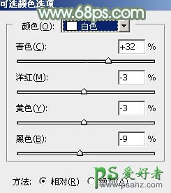 12、创建可选颜色调整图层,对红、黄、绿、青、白进行调整,参数设置如图32 - 36,效果如图37。这一步把图片中的青绿色调淡一点。