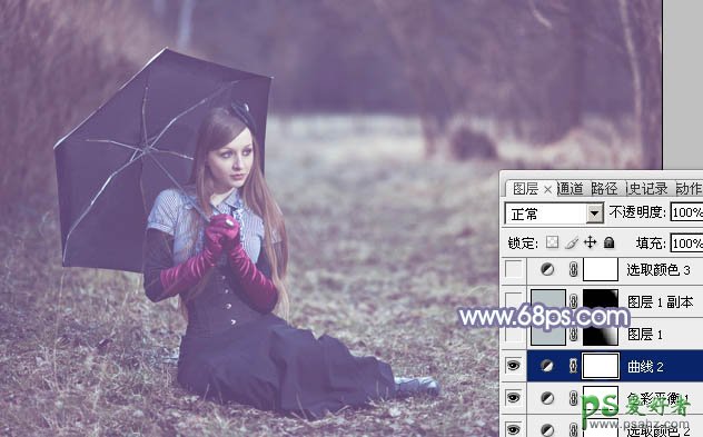 7、创建曲线调整图层,对RGB、红、绿、蓝各通道进行调整,参数及效果如下图。这一步微调图片暗部颜色。