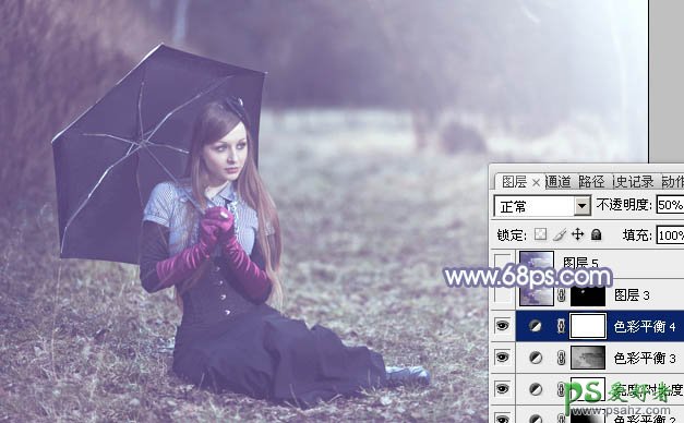 13、创建色彩平衡调整图层,对高光进行微调,参数设置如图34,确定后把图层不透明度改为:50%,效果如图35。