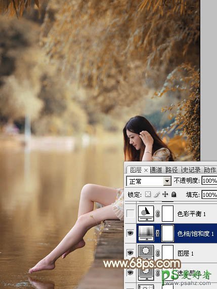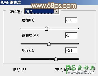 4、创建色相/饱和度调整图层,对黄色进行调整,参数及效果如下图。这一步把图片中的黄褐色转为红褐色。