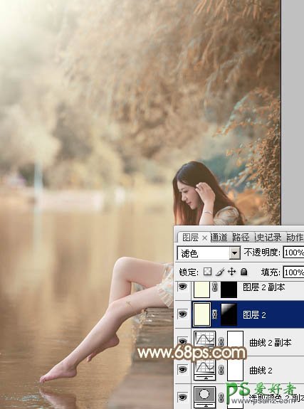 10、新建一个图层填充淡黄色:#FBFBE1,混合模式改为“滤色”,添加图层蒙版,用黑白渐变由左上角至右下角拉出白色至黑色线性渐变,效果如下图。