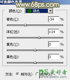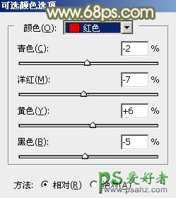 2、创建可选颜色调整图层,对红、黄、绿进行调整,参数设置如图5 - 7,效果如图8。这一步给图片增加橙红色。