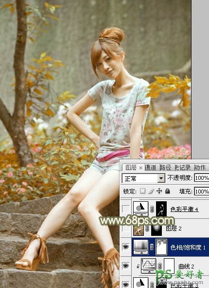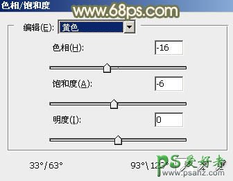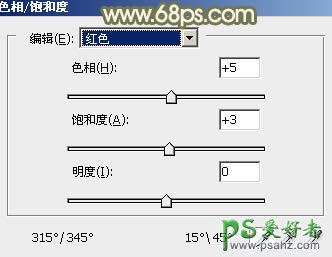 6、创建色相/饱和度调整图层,对红色,黄色进行调整,参数设置如图20,21,确定后用黑色画笔把顶部位置涂出来,效果如图22。这一步把图片中的橙黄色转为红褐色。