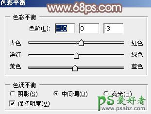 8、创建色彩平衡调整图层,对阴影、中间调、高光进行调整,参数设置如图23 - 25,确定后把蒙版填充黑色,用白色画笔把人物脸部及肤色部分擦出来,效果如图26。这一步微调人物肤色。