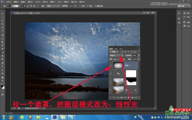 第三步:新建空白图层,黑到白线性渐变,拉一个遮罩,把图层模式改为:线性光,调一下图层的不透明度