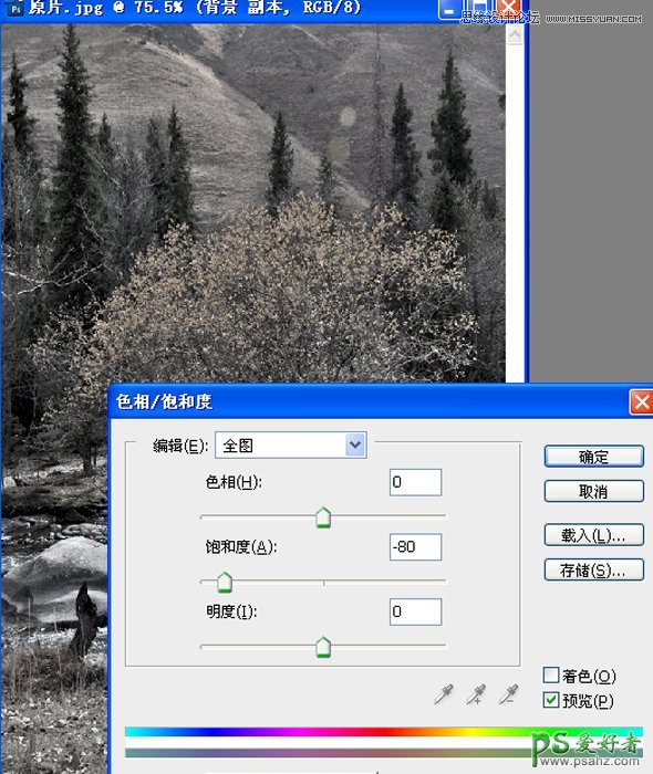 第三步:复制图层,执行:色相/饱合度,为下一步叠加做准备。如果嫌执行:色相/饱合度麻烦,干脆执行:去色,效果基本上是一样的,只有细微的区别
