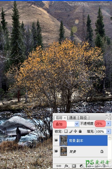 第四步:把执行:色相/饱合度的图层不透明度改为25%,(可以根据图片的灰度情总进行修改,不透明度越高反差越大,反之反差就越小)。把图层模式改为:叠加或柔光,叠加可以提高图像的对比度和颜色的饱合度,因为只对25%的图层进行叠加,所不叠加后颜色和对比度不会“过”,如果觉得有点“过”,可以把图层的不透明度改小一点