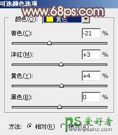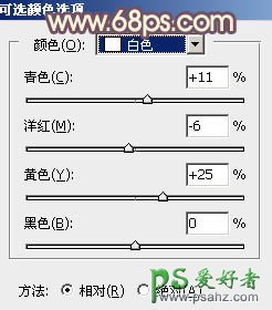 2、创建可选颜色调整图层,对黄、蓝、白、中性、黑进行调整,参数设置如图4 - 8,效果如图9。这一步给图片增加橙红色。