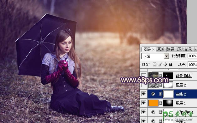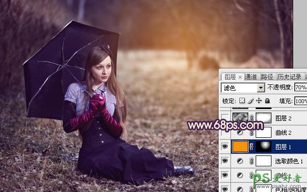 6、创建纯色调整图层,颜色设置为橙红色:#F79205,确定后选择渐变工具,颜色设置为黑白渐变,然后由人物右侧中间位置向边角拉出白色至黑色径向渐变。确定后把混合模式改为“滤色”,不透明度改为:70%,效果如下图。这一步给图片增加高光。