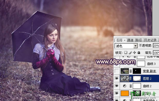 8、新建一个图层,按字母键“D”把前景背景恢复到默认的黑白,选择菜单:滤镜 > 渲染 > 云彩,确定后把混合模式改为“滤色”,不透明度改为:20%,添加图层蒙版,用黑色画笔把边角部分擦出来,如下图。