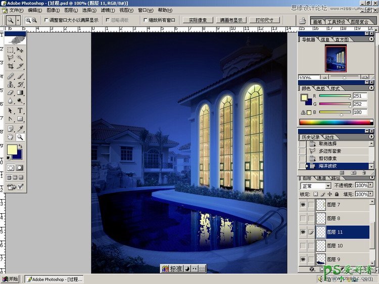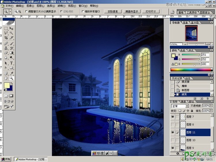 Photoshop给一张白天拍摄的别墅风景图片调出逼真的夜景效果