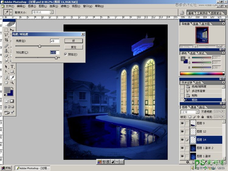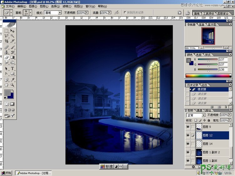 Photoshop给一张白天拍摄的别墅风景图片调出逼真的夜景效果