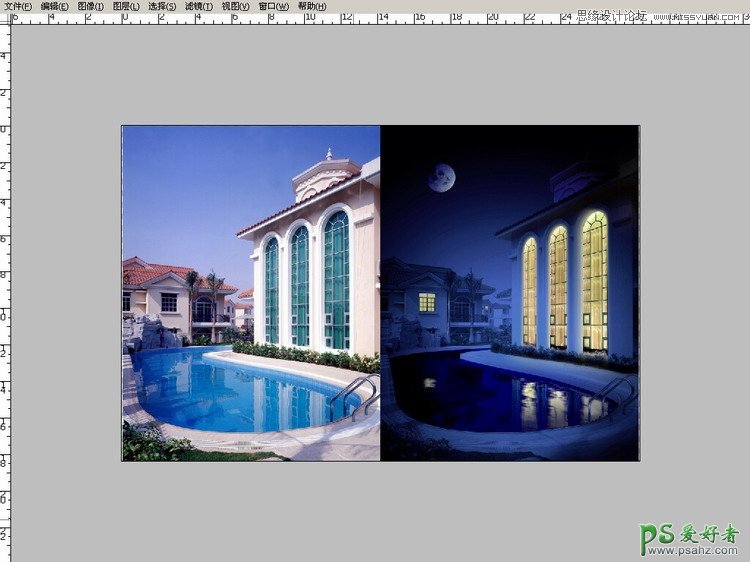 Photoshop给一张白天拍摄的别墅风景图片调出逼真的夜景效果