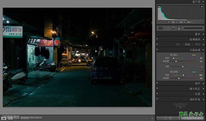看到这样的街道,让我想到香港电影里的街道,冷暖对比强烈,那么这张照片,我们就利用远处的黄色光跟前面店铺的白色光来体现冷暖色调。