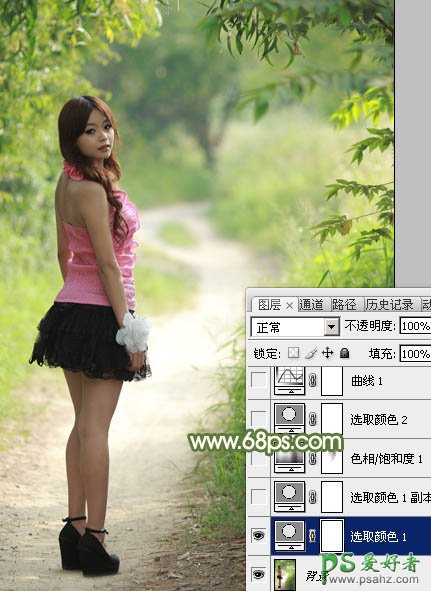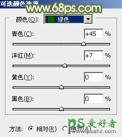 1、打开素材图片,创建可选颜色调整图层,对绿色进行调整,参数及效果如下图。这一步把绿色部分调浓一点。