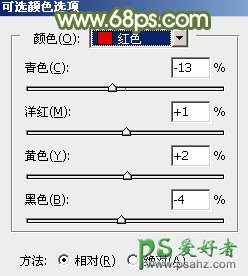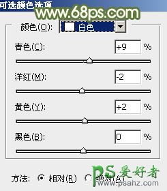13、创建可选颜色调整图层,对红、黄、白进行调整,参数设置如图30 - 32,确定后同上的方法创建剪贴蒙版,效果如图33。这一步微调人物肤色。