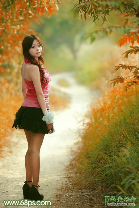 Photoshop调出橙红色性感美女外拍生活写真照-让照片变得更加温馨,我们的素材图片是黄绿色调的,我们调色的时候重点把黄色部分单独转为橙红色,绿色部分可以稍微加深一点,然后把人物部分调亮即可。 原图