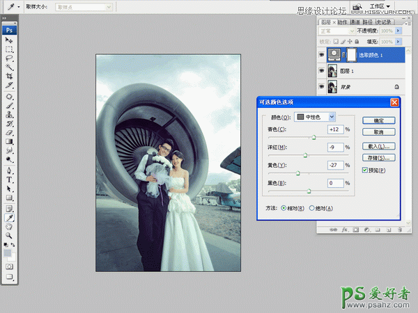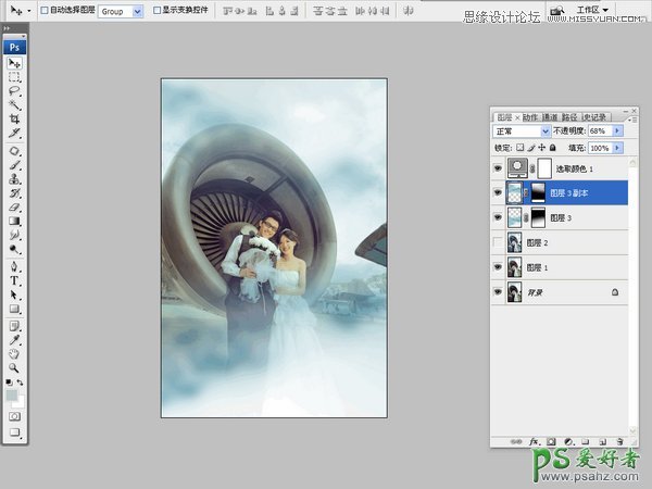 我们来分析调色步骤。背景是飞机螺旋桨,给人一种厚重大气的感觉。光线压的很暗,简洁干净,突出人物。首先,需要把照片细节提亮,更改冷艳一些的色调,螺旋桨的质感给塑造出来,加入白色烟雾素材,让画面具有冬天的感觉,最后再制作一些雪花做点缀,整体效果就好了。