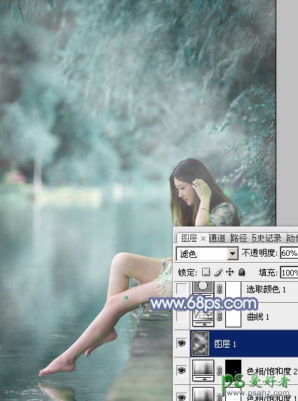 2、新建一个图层,按字母键“D”把前背景颜色恢复到默认的黑白,然后选择菜单:滤镜 > 渲染 > 云彩,确定后把混合模式改为“滤色”,不透明度改为:60%,效果如下图。这一步给图片增加烟雾效果。
