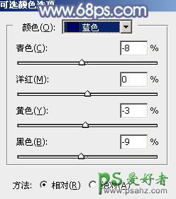 4、创建可选颜色调整图层,对青、蓝、白进行调整,参数设置如图10 - 12,效果如图13。这一步给图片增加淡蓝色。