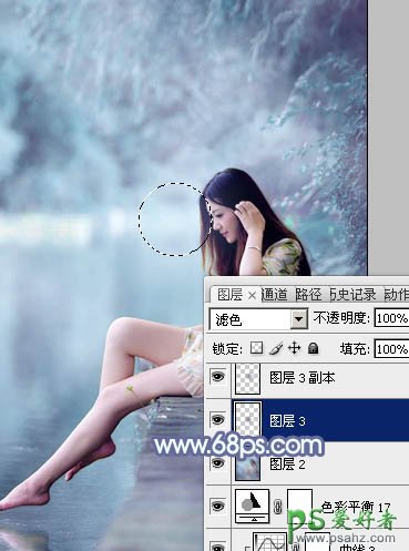 12、新建一个图层,混合模式改为“滤色”,用椭圆选框工具拉出下图所示的椭圆选区,羽化30个像素后填充深蓝色:#475070,效果如下图。