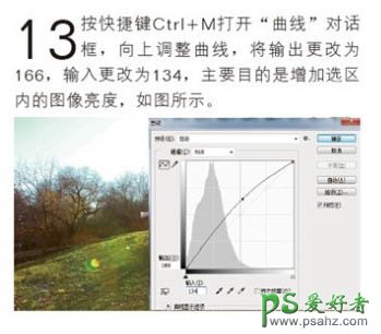 13、按Ctrl + M 打开曲线对话框,向上调整曲线,将输出更改为166,输入更改为134,主要目的是增加选区内的图像亮度,如图。