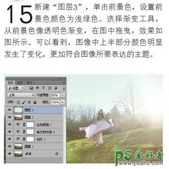 15、新建“图层3”,单击前景色,设置前景色为浅绿色。选择渐变工具,从前景色向透明色渐变,在图中拖拽,效果如下图。